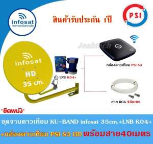 สินค้าอาจมีการเปลี่ยนแปลงราคาและโปรโมชั่น โปรด เช็คราคาล่าสุด ชุดจานดาวเทียม Infosat KU-BAND 35cm.(ยึดผนัง)+กล่องดาวเทียม PSI S3 HD พร้อมสาย40เมตร(เลือกสีจานได้) >ที่นี่