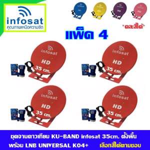 - 1.คุณสมบัติ INFOSAT จานดาวเทียมแบบตั้งพื้น ขนาด 35ซม.1. เหมาะกับผู้ที่อาศัยตามคอนโดมีเนียม ที่ไม่สามารถติดตั้งจานใหญ่ได้ หรือ เมื่อต้องเดินทางไปแคมป์ปิ้ง หรือออกนอกสถานที่2. สามารถใช้รับสัญญาณระบบ Thaicom Ku-Band หัวรับแบบ Universal เป็นหัวรับรุ่นใหม่ ที่รองรับช่องรายการที่ออกอากาศดาวเทียมไทยคม 8 ซึ่งช่องรายการใหม่ ๆ หรือช่องรายการเดิม จะมีการเปลี่ยนแปลงไปออกอากาศผ่านดาวเทียมไทยคม 8 เพิ่มมากขึ้นเรื่อย ๆ ก็จะทำให้หัวรับชนิด Universal ใช้ได้คุ้มไปอีกนาน3. ชุดจาน Infosat ชุดนี้ เนื่องจากหัวรับเป็นแบบ Universal ทำให้สามารถนำไปติดตั้งได้กับกล่องรับดาวเทียมได้หลายยี่ห้อ อาทิ กล่องรับดาวเทียมไทยคม IMP HD Pro3, Up HD, SD, DTV HD, True HD2, PSI Okx, S2HD, O2XHD, Infosat AEC HD, HD1.2, HD1.1, Zimbox3, GMMZ HD, Slim, Smart, Mini เป็นต้น